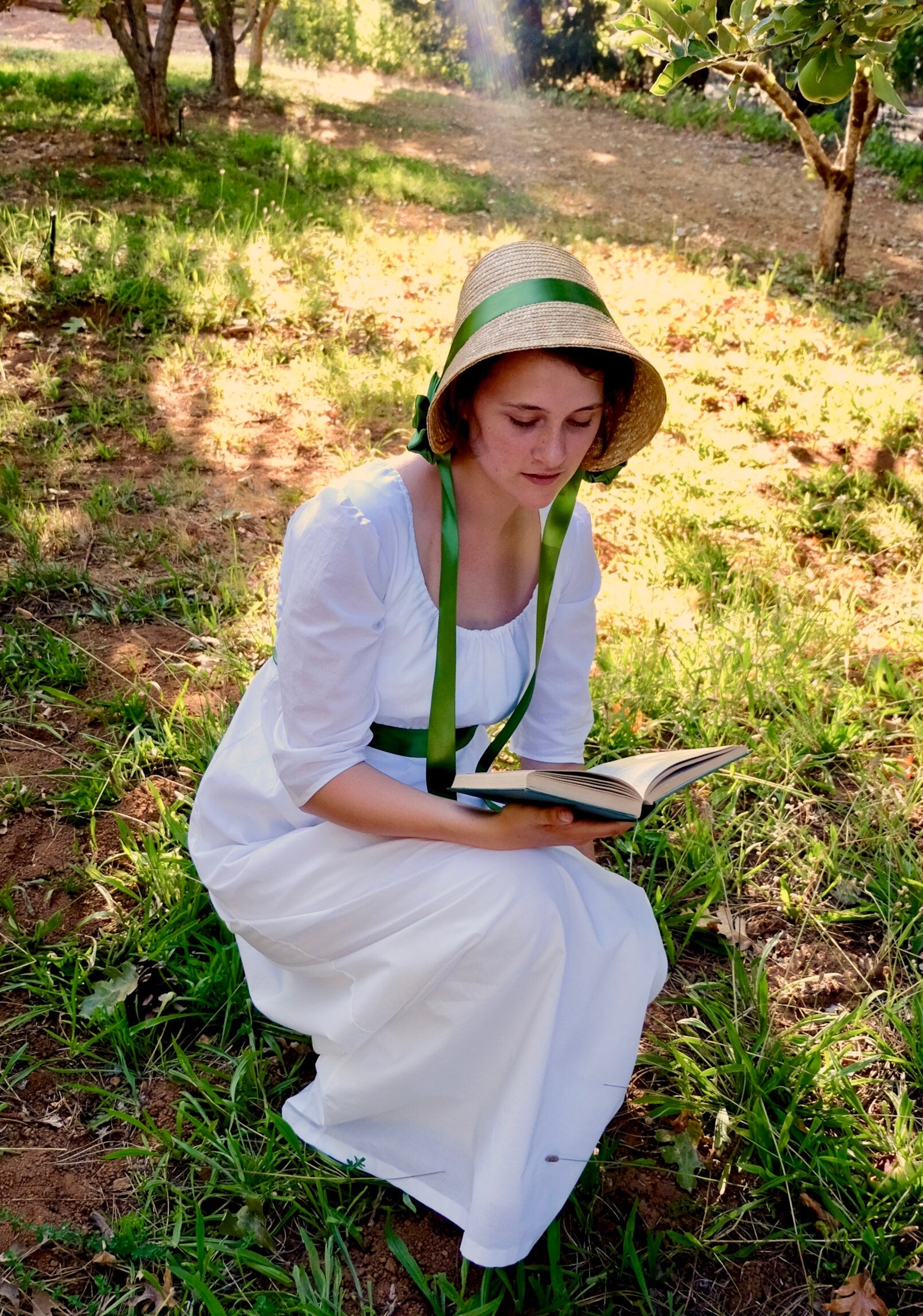 Thither's exclusive drawstring Regency dress is made of delicate cotton lawn and cotton thread, meaning every part of the gown can be dyed. It can be worn at a picnic with one of our straw bonnets or to an evening of dancing at a ball. Sewn in simple and elegant white, it is ideal for trimming with lace, flowers, an overdress or a simple ribbon.
