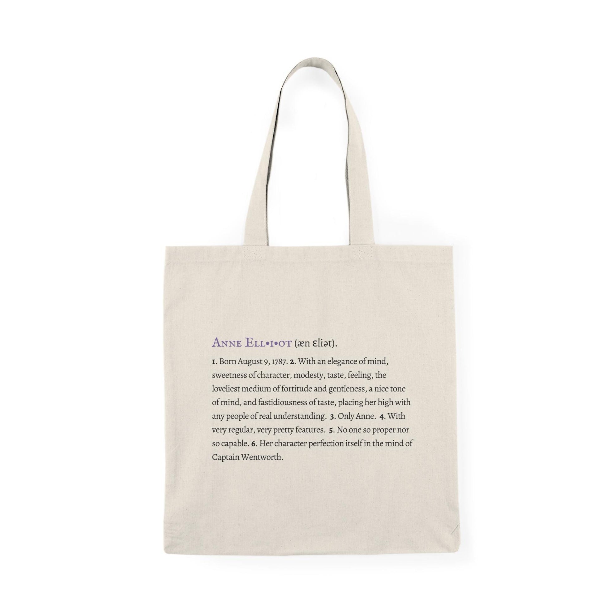 Now you can show your love of Jane Austen's most elegant heroine! Now everyone can see what about Miss Anne Elliot that you admire (and perhaps makes you laugh), with our Definition Tote Bags.