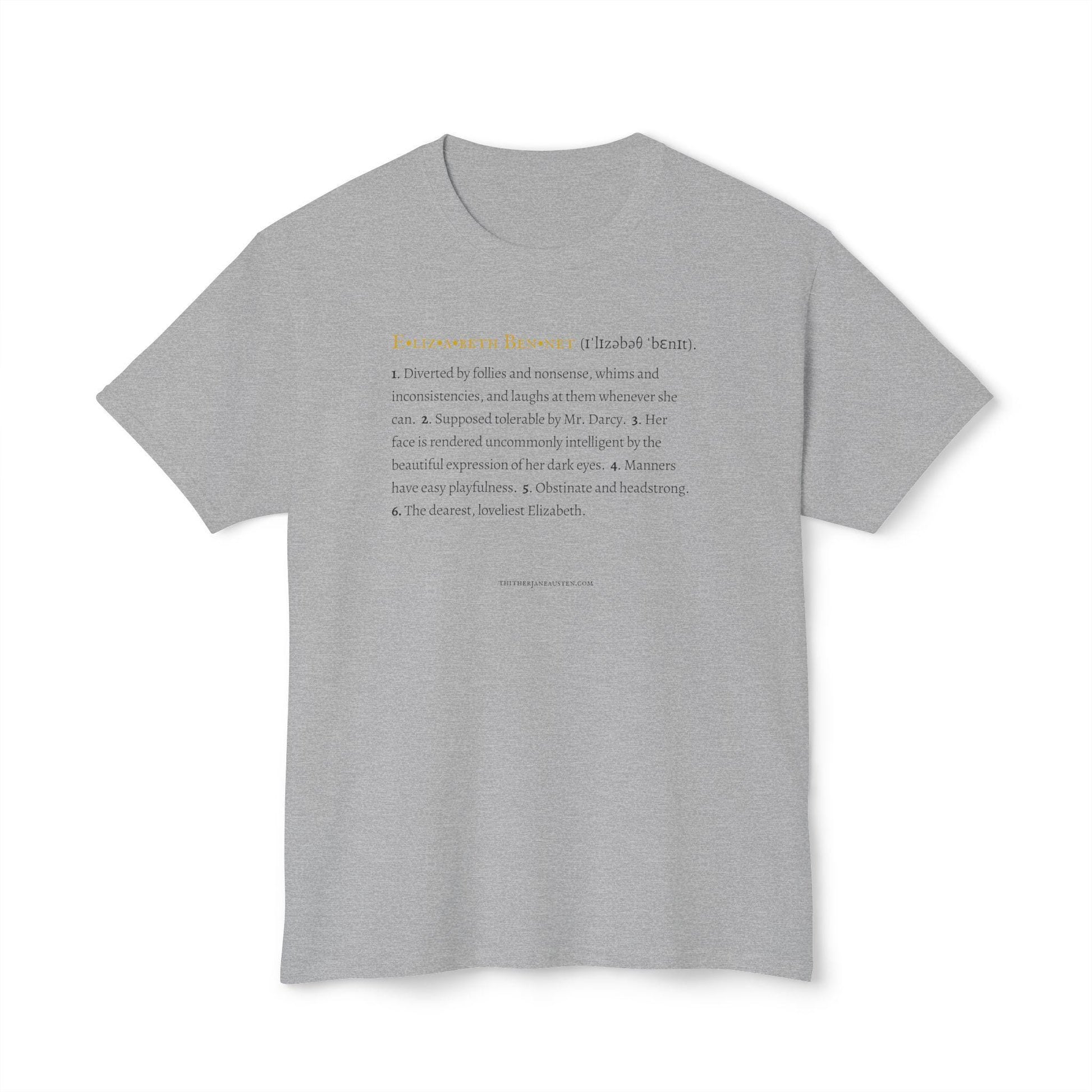 Our Jane Austen character definition collection defines each of her heroes and heroines as a dictionary entry using Jane's own words. This shirt is for admirers of Jane's heroine of the wit and fine eyes, Miss Elizabeth Bennet of 'Pride and Prejudice'! This shirt brings a literary vibe to any wardrobe. Ideal for book lovers and fans of classic literature, it's a great choice for literary events, book clubs, and casual everyday wear.