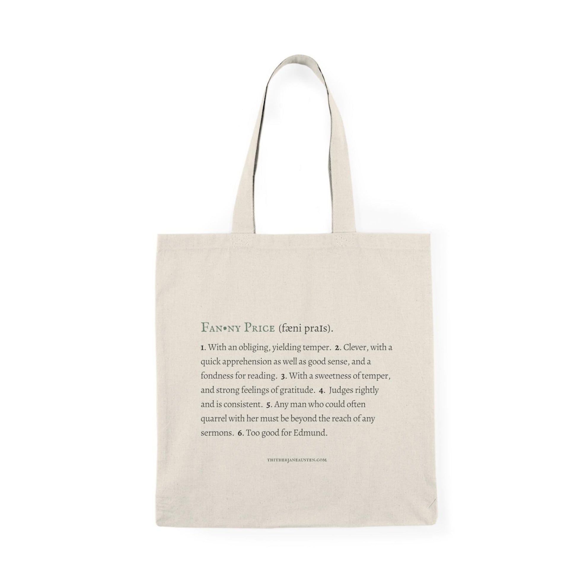 A 100% cotton tote bag features Jane Austen's gentle and steadfast Fanny Price in the form of a dictionary entry! Perfect for adding a bit of Jane's style and wit to your daily routine, or as a gift for the Jane Austen fans in your life.