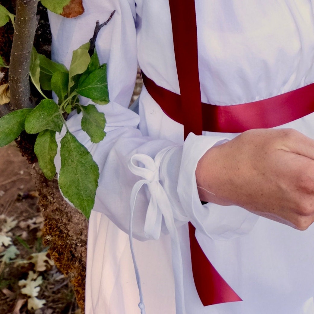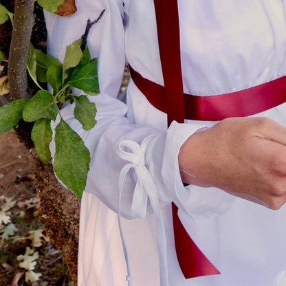 The waist and neckline each include a drawstring, making them easily adjustable for the wearer. Every gown is equipped with side belt loops for a ribbon to keep everything in place.