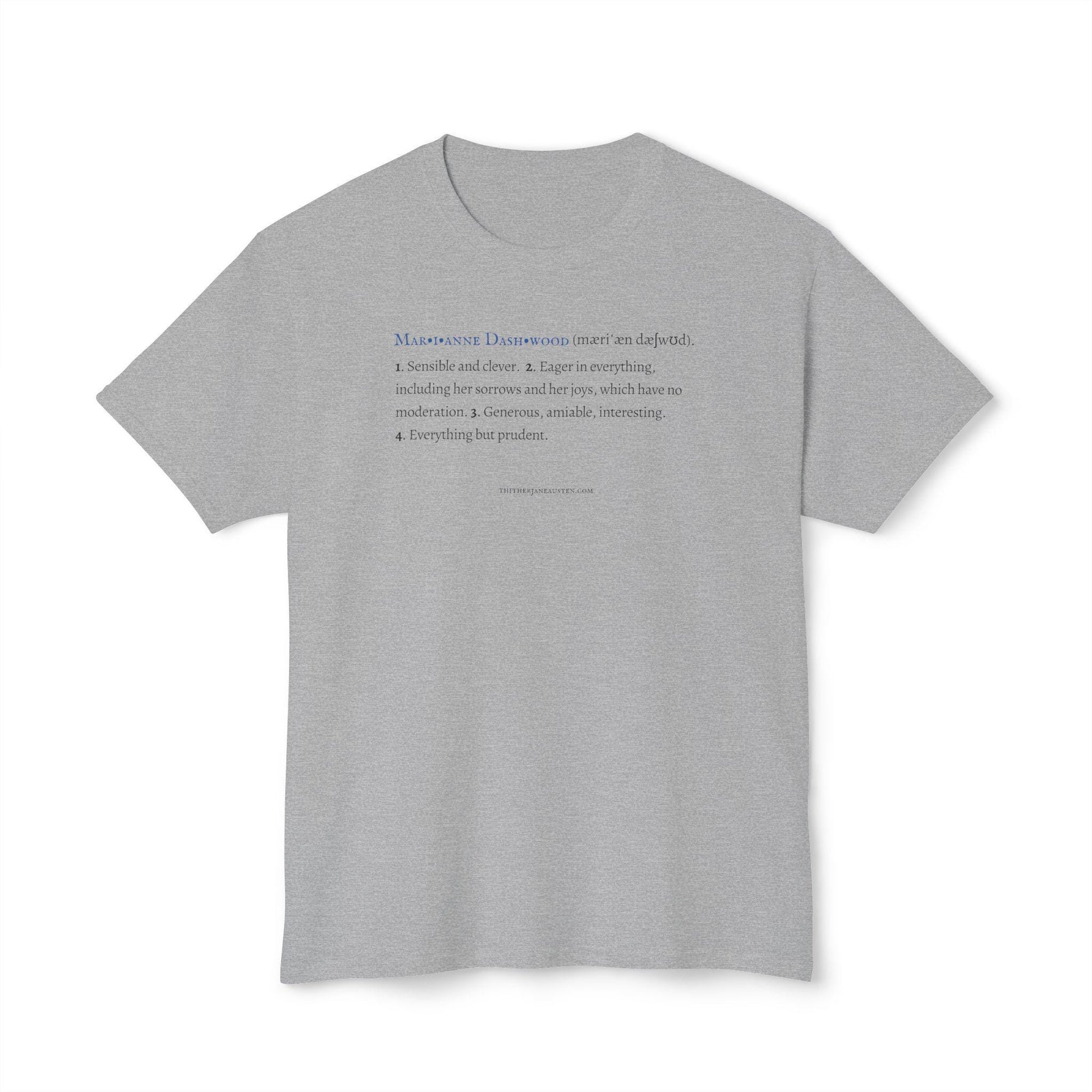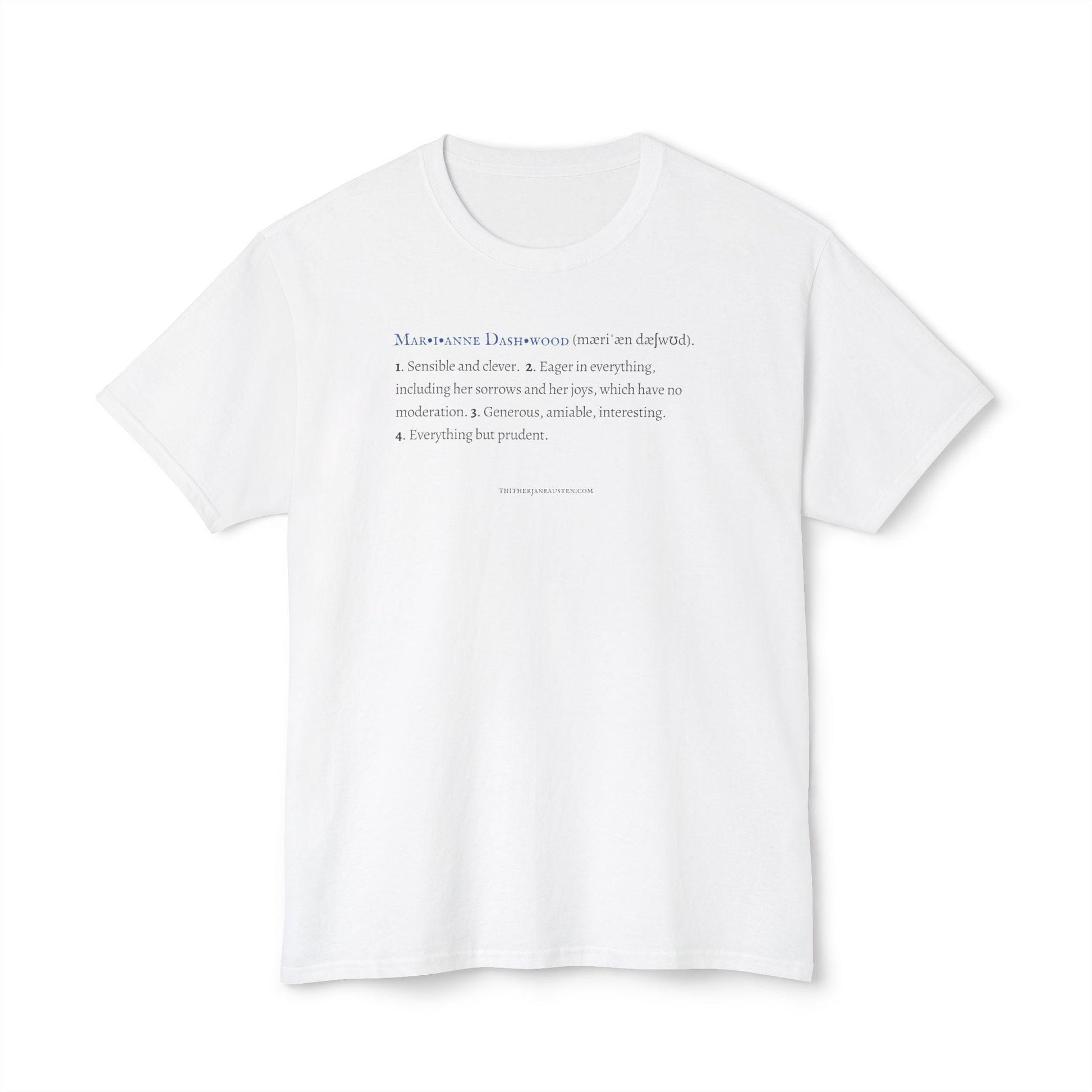 This Jane Austen character definition T-shirt showcases the romantic heroine Marianne Dashwood from 'Sense and Sensibility'. Perfect for admirers of Jane's work, this tee adds a literary touch to any wardrobe. Ideal for book lovers and fans of classic literature. Great for celebrating World Book Day, National Library Week, or as a thoughtful gift for a fellow Jane Austen enthusiast.